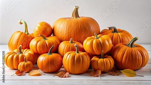 Vibrant orange pumpkins of various sizes and shapes scattered across a clean, crisp white background, creating a warm and inviting seasonal still life composition.