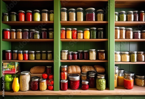 vibrant pantry shelves overflowing colorful food donations displaying variety canned fresh produce arranged neat inviting manner, arrangement, assortment, bulk