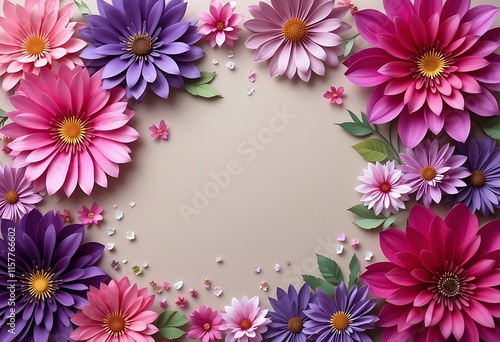 Vibrant Paper Flower Arrangement in Purple and Pink on Neutral Background - Artistic Décor Display