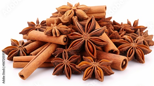 Vibrant photo of cinnamon sticks and star anise on a white background for culinary and seasonal themes.