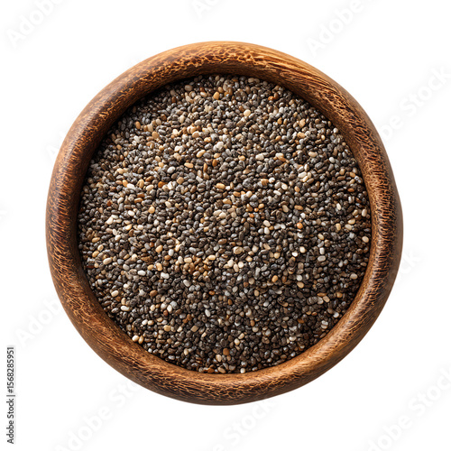 Vibrant photo of top view of a wooden bowl filled with chia seeds isolated on transparent background.