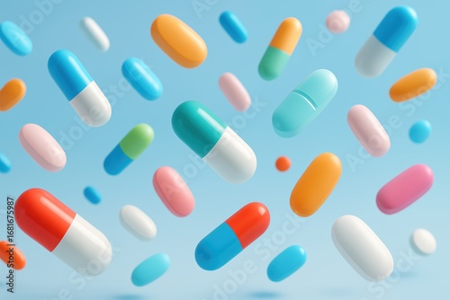 Vibrant Pills in Artistic Display: An array of colorful pills float amidst a vibrant backdrop, creating a captivating display of modern medicine and health