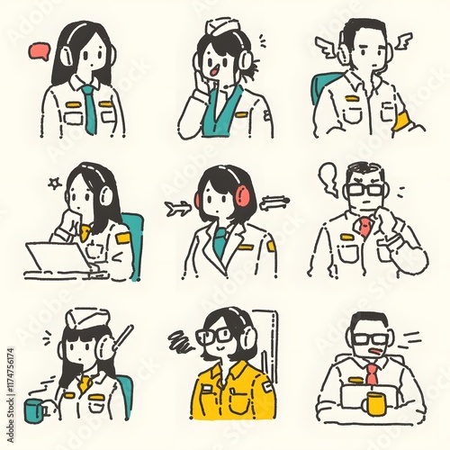 Vibrant Pilot Uniform Icons in Minimalist Graffiti Style on Solid Background