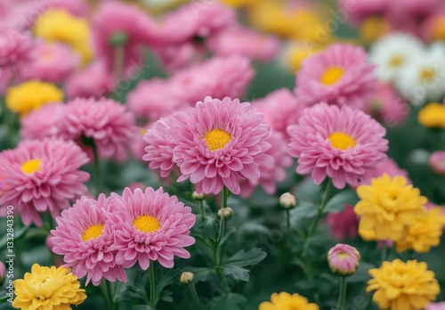 Vibrant Pink and Yellow Flowers in a Colorful Garden Setting with Soft Focus Background Ideal for Floral Displays and Nature Photography