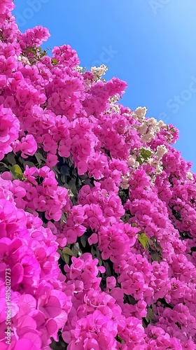 Vibrant pink bougainvillea flowers cascade against a clear blue sky on a beautiful sunny afternoon