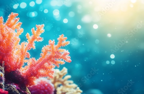 Vibrant pink coral reef underwater scene with sunlight.