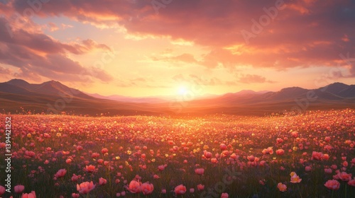 sunset, field, flower, pink, orange, sky, landscape, nature, scenic, beautiful, vibrant, gold, hours, warm, peaceful, serene, tranquil, calm, summer, spring, flora, meadow, sun, horizon, cloud, colours, light, ray, mountain, hill, rural, countryside, outdoors, bright, optimistic, hopeful, joyful, romantic, idylli, dreamy, magical, wonder, awe, amazing, breathtaking, stunning, spectacular