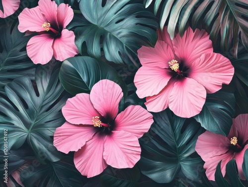 Vibrant pink hibiscus flowers and tropical leaves arranged in a lush display