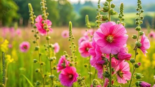 Vibrant pink hollyhock flowers blooming in a lush green meadow with tall grasses and wildflowers surrounding them