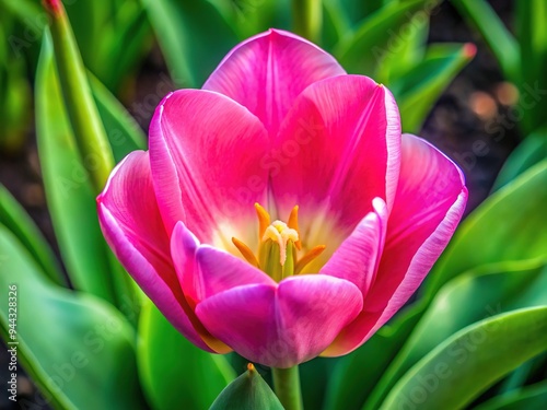 Vibrant pink tulip blooms from above, showcasing delicate petals, golden anthers, and a slender green stem against a soft, blurred background.