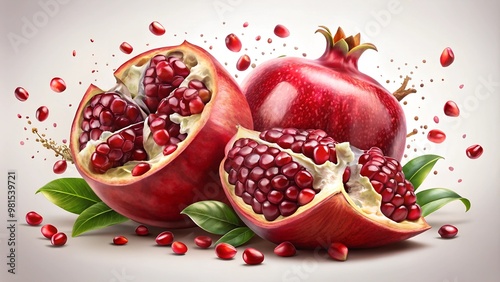 Vibrant pomegranates with one cut open revealing juicy seeds on a light background