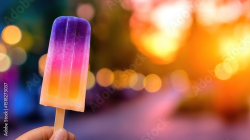 Vibrant popsicle held against a sunset backdrop with blurred street lights creating a warm ambiance
