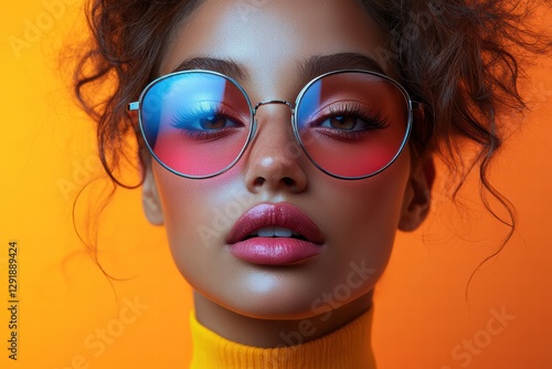 model, portrait, eyewear, sunglasses, orange, fashion, beauty, stylish, curve, colourful, make-up, coiffure, confidence, studio, aesthetic, contemporary, trend, accessory, creative, pose, charming, young adult, cosmetic, expression, facial features, head shot, glamour, striking, urban, chic, playful