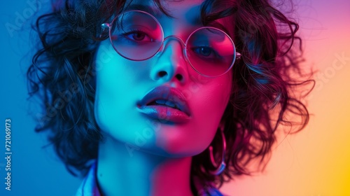 Vibrant portrait of a stylish woman with glasses in neon lights. Ideal for modern fashion and lifestyle themes.