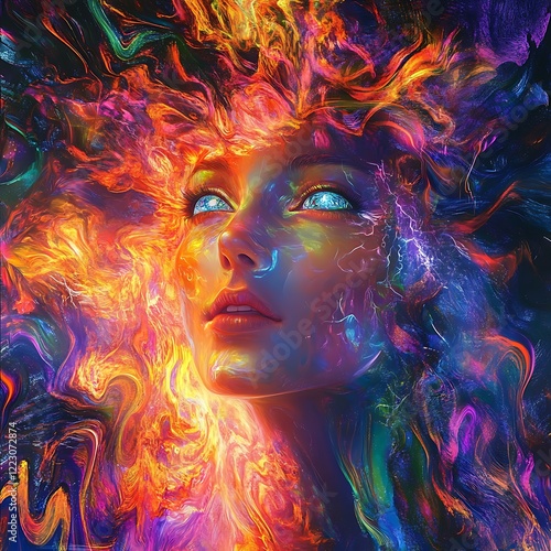 woman, face, portrait, fire, flames, energy, light, colourful, vibrant, abstract, fantasy, surreal, glowing, iridescent, cosmic, mystical, spiritual, powerful, intense, passion, beauty, artistic, digital, art, illustration, imagination, creative, expression, visionary, dreamlike, whimsical, intriguing, enigmatic, hair, blue, eye, fiery, skin, dark, background, bright, colours, mixed, media, hallucinogen, modern, contemporary, avant-garde