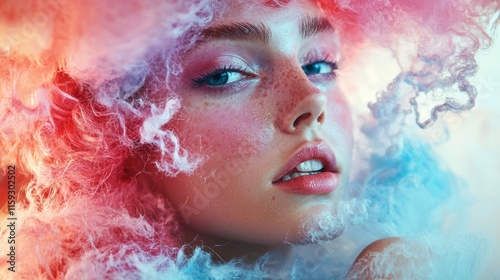 woman, portrait, vibrant, smoke, colourful, artistic, bold, radiant, trendy, aesthetic, imaginative, contemporary, lively, striking, glowing, aethereal, dreamy, harmonious, inviting