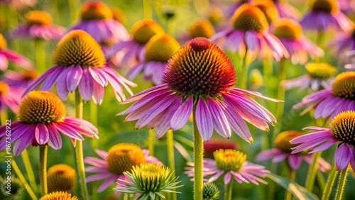 Vibrant purple and yellow echinacea cone flowers bloom in a lush green meadow, swaying gently in the breeze, capturing the beauty of summer's warm essence.