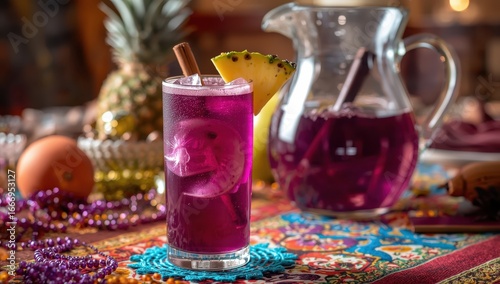 purple, drink, glasses, pineapple, cinnamon, garnish, festive, family, table, colourful, vibrant, pitcher, beverage, peruvian, sweet, cold, refreshing, tropical, traditional, fruit, slice, transparent, celebration, bright, lighting, party, warm, decorative, element, exotic, dessert, authentic, served, summer, cultural, high-coloured, delicious