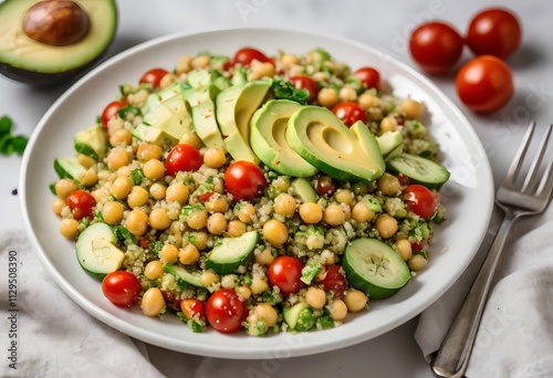 Vibrant quinoa salad with chickpeas, avocado, cherry tomatoes, and cucumber, topped with a refreshing lemon vinaigrette, ai.
