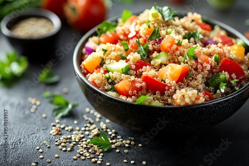 Vibrant quinoa salad with fresh vegetables and herbs, perfect for a healthy meal or side dish, rich in nutrients and flavor.