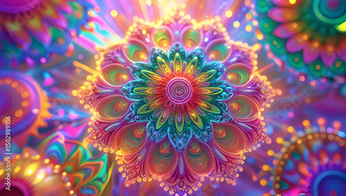 Vibrant rainbow mandala hypnotic swirling patterns psychedelic art fantasy floral design