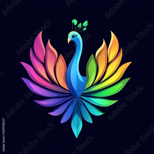 peacock, bird, rainbow, feather, colourful, stylised, elegant, graceful, majestic, dark, background, logotype, design, illustration, vector, art, graphic, vibrant, colours, pride, beauty, nature, wildlife, animal, fantasy, mythical, symbol, power, serenity, peace, harmony, calmness, royalty, luxury, sophistication, abstract, modern, contemporary, gradient, shape, form, pattern, texture, image, artwork, visual, brand, icon