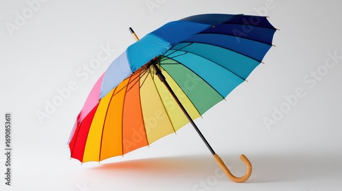 umbrella, rainbow, colourful, bright, canopy, handle, textured, uplift, fashion, lifestyle, weather, protection, pattern, colours, design, pleated, wood, accessory, marketing, commercial, seasonal, sunshine, cheerful, isolated, studio, photo, decorative, visual, artistic