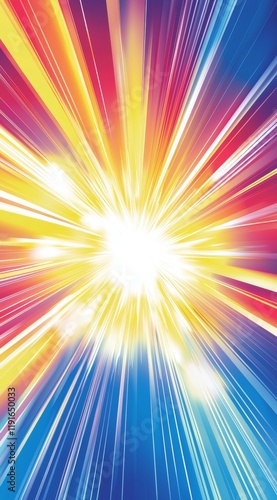 Vibrant rays of light in various colors emanate from a bright central point, creating a dynamic and energetic abstract background, perfect for conveying concepts of speed, power, and excitement