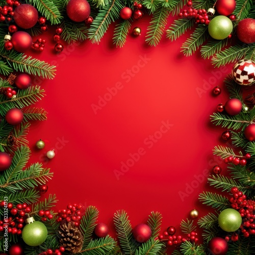 Vibrant red background with festive frame of red ornaments and pine branches