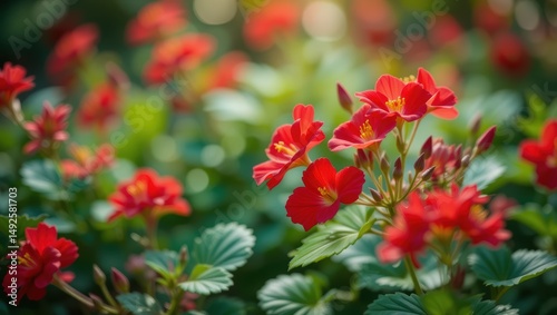 Vibrant Red Blossoms Among Lush Green Foliage in a Sunlit Garden Setting
