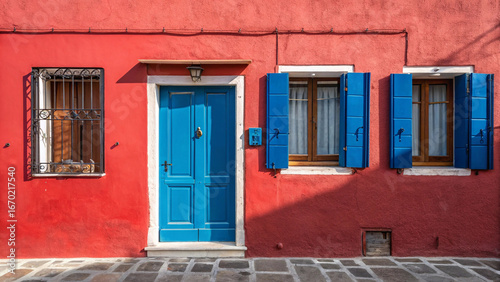 Vibrant red building facade with a bright blue door and windows
