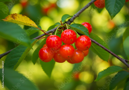 Vibrant Red Cherries Cluster on Branch Lush Green Leaves Summer Orchard