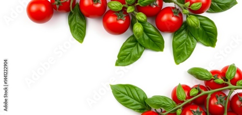 Vibrant red cherry tomatoes & fresh green basil leaves arranged on pristine white background, red, still life