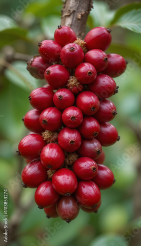 red berry, fruit, plant, agriculture, farming, harvest, crop, botany, horticulture, red, round, flocked, bunch, stem, tree branch, leaf, growth, nature, organic, food, beverage, caffeine, cultivation, plantation, berry, coffee bean, natural, vibrant, juicy, glossy, fresh, healthy, delicious, sweet, tart, arabica, robusta