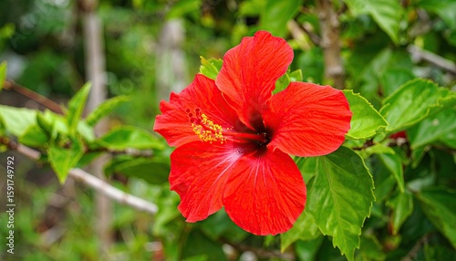 Vibrant red hibiscus flower in lush foliage