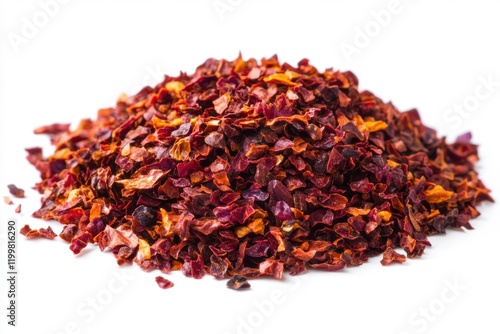 Vibrant red paprika spice heap on clean white backdrop perfect for culinary presentations and food photography collections