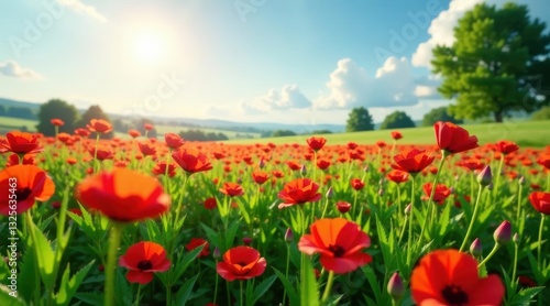 Vibrant Red Poppies Blooming in a Sunlit Meadow Under a Summer Sky