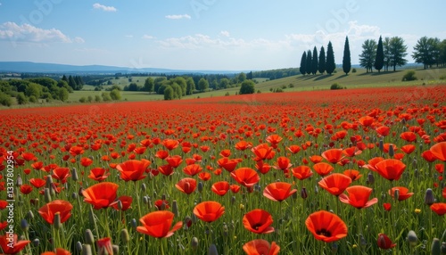 poppy, flower, field, landscape, nature, red, green, countryside, summer, bloom, bright, sky, scenic, calmness, meadow, rural, sunlight, horizon, vibrant, flora, outdoors, sunshine, beauty, scenery, botanical, vegetation, summer day, plant, blossom, agriculture, growth, peaceful, sunny, colourful, seasonal, vivid colors, clear sky, sunny day, wildlife, flower garden, fresh air