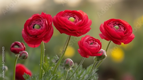 Vibrant red ranunculus flowers blooming in a garden during the warm afternoon sunlight, creating a stunning natural display