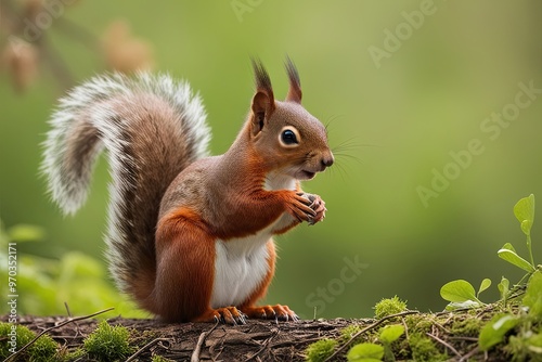 Vibrant Red Squirrel Sitting on Lush Green Background in Natural Habitat