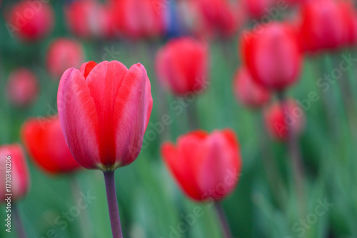 tulip, red tulip, flower field, spring flower, garden, blooming, nature, green background, flower petals, flora, flora, botanical, blurred background, depth of field, blossom, natural world, fresh flower, growth, green leaf, springtime, bright red, vivid colors, natural beauty, soft focus, natural light, full bloom, arboretum