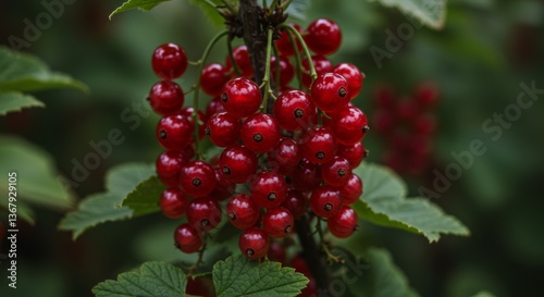 Vibrant Redcurrant Cluster against Lush Green Foliage in Natural Light