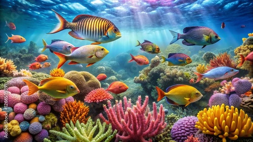 Vibrant Reef Ecosystem A Colorful Underwater Scene Showcasing Diverse Marine Life and Coral Formations