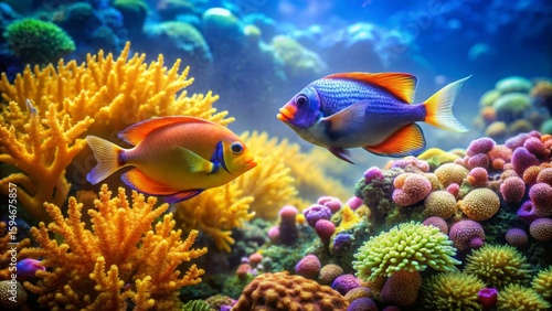 Vibrant Reef Inhabitants Two Colorful Fish Gracefully Swim Amidst a Lush Coral Garden, a Serene Underwater Paradise