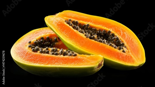 Vibrant, Ripe Papaya Slices on Black Background, Showcasing Smooth Skin, Orange Yellow Tones
