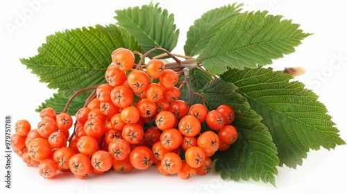 Vibrant ripe rowan berries cluster on branch against a clean white background close up view