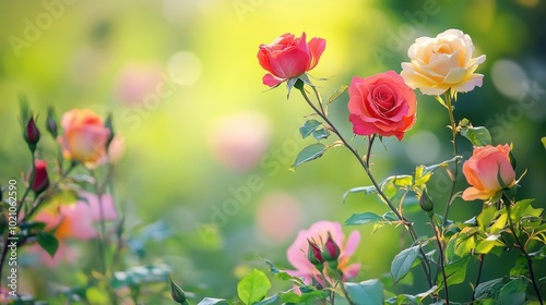 Vibrant roses blooming in a sunlit garden, showcasing shades of pink, red, and yellow.