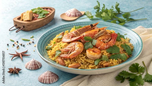 Vibrant seafood biryani capturing the essence of fresh prawns and aromatic spices in a coastal setting