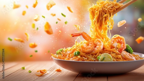 Vibrant Shrimp Chow Mein with Colorful Vegetables and Noodles on a Wooden Table with Warm Background