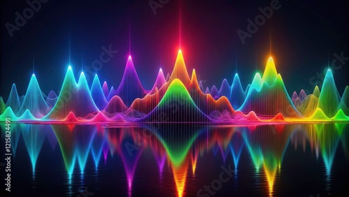 Vibrant Sound Wave Visualization with Colorful Peaks, Reflections, and Dark Background for Audio and Music Technology Concepts